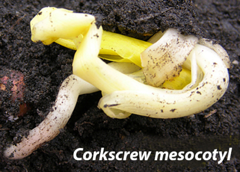 Corn needs between 100 and 130 GDDs to emerge, so if soil conditions remain cool and wet after planting, emergence can be significantly delayed. Prolonged exposure to soils cooler than 50° F or 25-30° F swings in air temperature have been associated with corkscrewed seedling growth and leafing out underground.