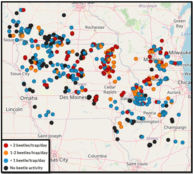 University and extension research has established thresholds for the number of beetles/trap/day that lead to significant damage the following year. According to Iowa State University, fields that recorded peak beetle activity at or above 2 beetles/trap/day are at a high risk of damage the following year.