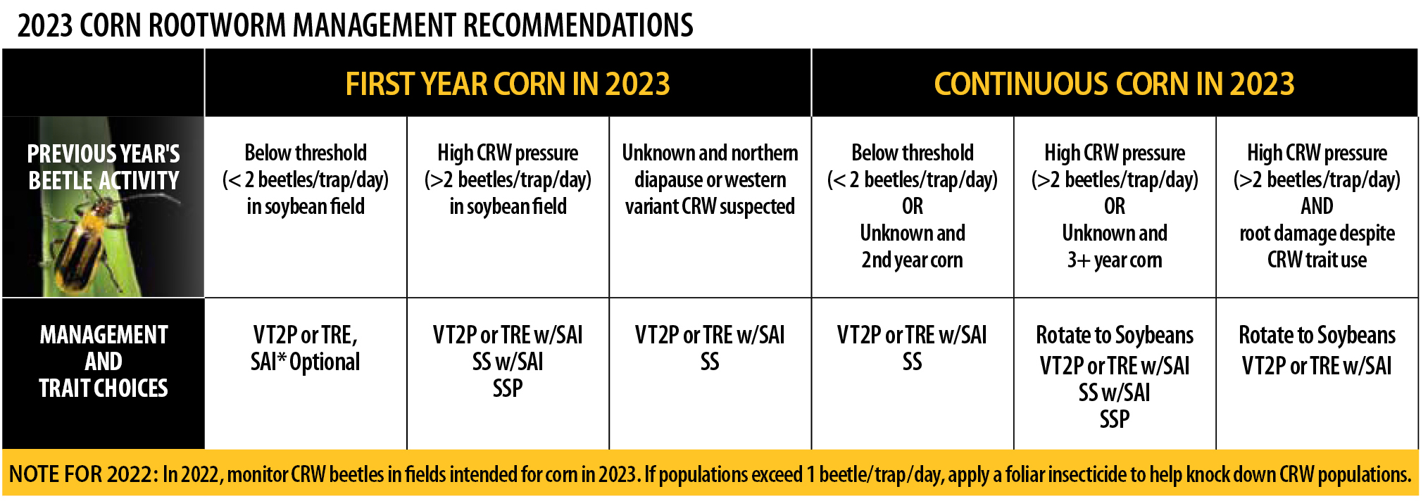 We have developed a decision table below that helps you determine the right management practice for each field based on the history and CRW beetle pressure in that specific field. You will also find recommendations in cases where the CRW beetle pressure is unknown. If you have questions or would like to discuss your plan, we encourage you to reach out to your Wyffels Seed Representative.