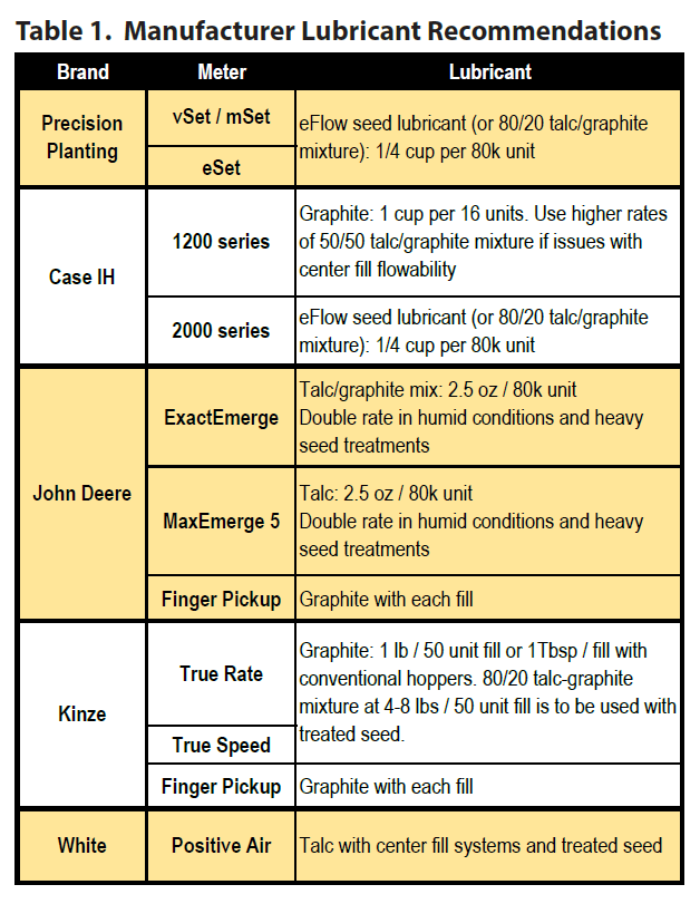 - Add the recommended talc/graphite in layers when loading to ensure even coverage. Manufacturerrecommended seed lubricants are listed in Table 1.