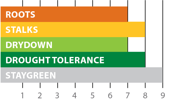 Semi-flex ear adapts to a wide population range. Excellent southern movement for maturity. Best performance in highly productive environments. Use a fungicide to protect high yield potential and extend harvest window.