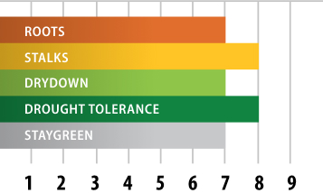 Excels at high populations, but flex ear compensates at lower populations. Likely to benefit from a fungicide application on continuous corn acres. Proven yield leader over a wide array of soil types.