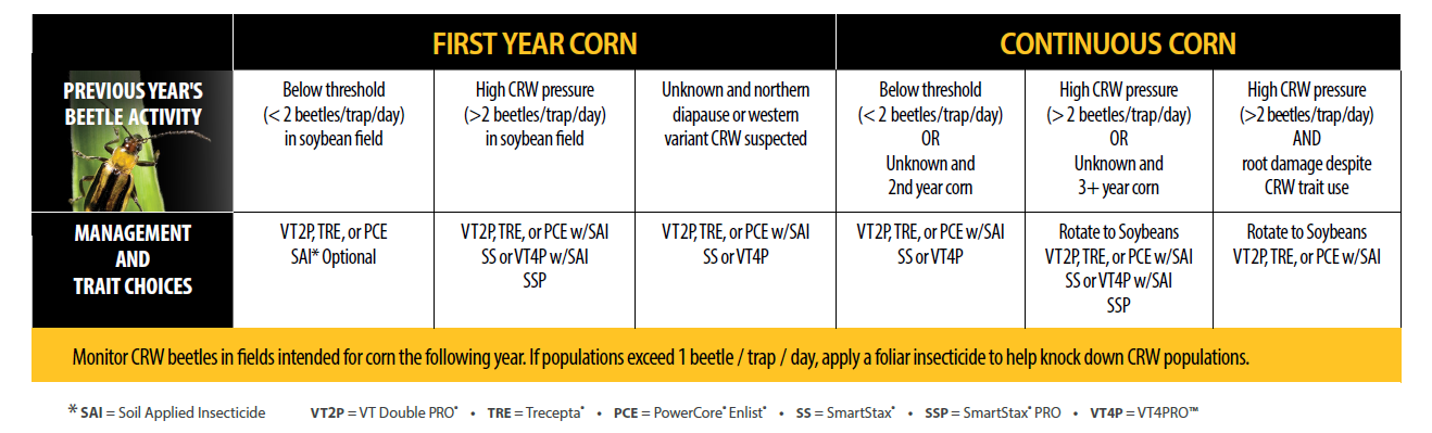 The days are gone where the only decision we have to make is what trait to use based on crop history, and this is no longer a decision that can be made blindly. Managing CRW involves gathering information and evaluating which tools are best for our situation. The use of CRW traits are one tool, but we must also consider the use of proven soil applied insecticides, adult beetle control, and crop rotation.